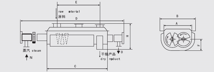 空心軸上密集排列著楔型中空漿葉,熱介質經空心軸流經漿葉。單位有效容積內傳熱面積很大,熱介質溫度從-40℃到320℃,可以是水蒸汽,也可以是液體型:如熱水、導熱油等。間接傳導加熱,沒有攜帶空氣帶走熱量,熱量均用來加熱物料。熱量損失僅為通過器體保溫層向環境的散熱。楔型漿葉傳熱面具有自清潔功能。物料顆粒與楔型面的相對運動產生洗刷作用,能夠洗刷掉楔型面上附著物料,使運轉中一直保持著清潔的傳熱面。漿葉干燥機的殼體為Ω型,殼體內一般安排二到四根空心攪拌軸。殼體有密封端蓋與上蓋,防止物料粉塵外泄而充分發揮作用。