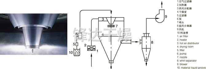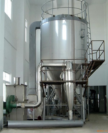 空氣經(jīng)過濾和加熱,進入干燥器頂部空氣分配器,熱空氣呈螺旋狀均勻地進入干燥室。料液經(jīng)塔體頂部的高速離心霧化器,(旋轉(zhuǎn))噴霧成極細(xì)微的霧狀液珠,與熱空氣并流接觸在極短的時間內(nèi)可干燥為成品。成品連續(xù)地由干燥塔底部和旋風(fēng)分離器中輸出,廢氣由風(fēng)機排空。
