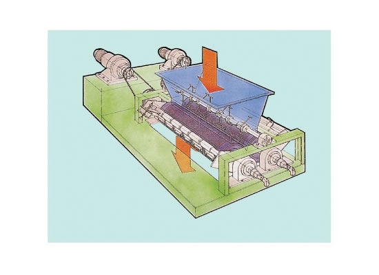 ◎槽形成型機: 由加料斗和刻有槽的二根輥子構成。以增大物料表面積的造粒為目的。物料被內側運轉的輥子吸入,被反轉的外側刮刀切成粒狀。